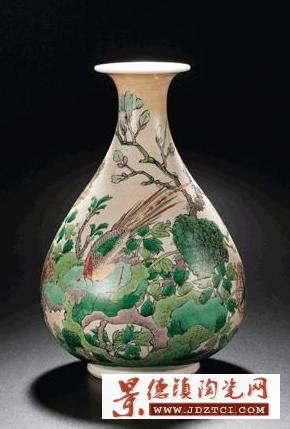 此件玉壺春瓶撇口,短頸,頸以下漸向外闊,至近底處內斂,圈足微外撇。其腹部渾圓大氣,身形挺拔壯碩,予人典雅尊貴之感,有明顯繼承明末玉壺春瓶式 的痕跡,線條圓潤敦實,少了一絲秀雅,多了一份雄渾,瓶身通體上米色釉,上釉旋轉痕跡明顯,主體紋飾于米黃色釉上以五彩繪洞石錦雞玉蘭牡丹紋,寓意錦上添花,玉堂富貴,所繪紋飾工細,全部圖案均以墨線描邊,然后在輪廓內填彩。紋飾圖案繁復工整,于錦俏熱鬧之余,尚有一絲文人畫氣息,靈動鮮活,惹人喜愛,而此瓶之紋飾與釉彩裝飾,則相對特殊,色地加彩在康熙之前的五彩器物中比較少見,明代曾有罐、爐一類以紅綠彩為地的彩繪器,但裝飾手法較為單一,所用顏色也相對簡單,而此件器物則安排了綿密繁復的圖案及畫面,雉雞紋的形象源自中國特有的鳥類紅腹錦雞,其翎羽華麗,色彩鮮艷,因極具裝飾效果,所以古人常以之入 畫,又因為其色彩華麗,又有錦繡繁華之意,配合其周邊所繪的竹石牡丹及玉蘭花卉,寓意吉祥,此圖案為康熙朝經典裝飾紋樣,在青花及青花五彩器物中反復出現(xiàn),可資參閱的例子也較多,后世有所繼承。在米釉上繪五彩紋飾為康熙朝新創(chuàng)裝飾方法,殊為罕見,即便是康熙本朝器物,也不為多見,因與之相類者寥寥,所以此風格的玉壺春瓶于拍場更是十分稀見,目前已知北京故宮博物院有一件清宮舊藏的米黃釉五彩玉壺春與之風格相同,但紋飾有所差別,高度略高于本件,且瓶底同 樣無款。