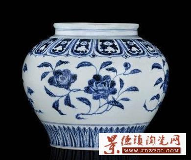 此罐是明代瓷器裝飾風格的典范。一改元青花的繁密華縟而代之以疏朗清秀,纏枝花卉于蓮瓣紋予人一種高雅大方的美感。紋飾與優(yōu)美的罐體相襯,愈顯宮廷 奢華之氣,展示了景德鎮(zhèn)官窯匠師非凡的藝術才華。整器用進口的“蘇麻離青”料繪制,筆法活潑流暢,線條粗細并用,彩料濃淡兼施。且不論著色深淺,紋飾效果 皆極為絢麗鮮艷、清新明快。在線條的紋理中布滿鈷鐵的結晶斑點,呈星狀點滴暈散,彩料濃重處則凝聚成黑青色結晶斑。正因為青料此一特性,令畫面富于水墨畫 般揮灑淋漓、蒼翠欲滴的意趣。所形成的此種藝術效果,“蘇麻離青”料固然是一方面原因,但更主要的還是匠師自身所具備的藝術修養(yǎng)與繪制技巧。每組花卉的形 態(tài)均系以極富中國畫傳統(tǒng)筆墨意韻之勾、勒、點、染等技法繪就,畫筆細膩傳神,表現(xiàn)出枝葉的翻轉扭曲、偃仰起伏之態(tài);花、枝、葉間的疏密聚散同樣是借鑒了國 畫的結構布局,得其法度,極富寫實效果,充分體現(xiàn)了匠師扎實深厚的筆墨功底;疏密有致的鋪排在視覺上亦形成了張弛有度的藝術效果。