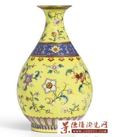 《黃地洋彩軋道錦地折枝洋花玉壺春瓶》 請乾隆年間 尺寸:29.3cm 成交價:29.3cmHKD;45,276,840RMB