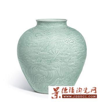 NO.6、清乾隆《粉青釉浮雕“蒼龍教子”圖罐》成交價:74,512,200元,刷新了單色釉拍賣紀錄。