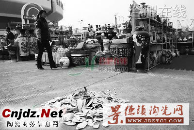 “100元四個,有人要嗎?沒人要就砸!碑(dāng)日上午10時許,在展銷會現(xiàn)場,“丁零當(dāng)啷”的破碎聲不絕于耳,只見十幾名展銷商高舉著瓷器一番叫賣仍無人回應(yīng)后,隨即把手中的瓷器重重摔到地上砸成了碎片。
