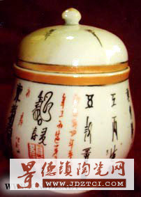 民國鼓式溫酒杯,高12厘米、圍26厘米,圈足、圓蓋、菱形紐。外套以紅墨彩書寫多體文字,繪圖印吉語“百歲多福”,一側(cè)書“博古通今”四字,落款江西出品。