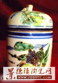 民國筒式套杯,高11厘米、圍23厘米,圓蓋桃鈕,套身繪青花粉彩山水圖,一側(cè)及蓋以行草書寫“可以清心”四字。彩頭、畫技均不佳,這種被稱為“笨拙粉彩” 是用一種劣料 的技法,民國時期景德鎮(zhèn)民窯多用于繪畫中下等瓷器。它與以上光緒兩品是無法媲美的,錄之供初入藏道朋友們參考而已。