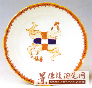 廣州博物館收藏了一件清代乾隆時(shí)期的廣彩四喜圖花口碟(如圖)。它高3.2厘米,口徑14.3厘米,足徑7.6厘米,是一件十分獨(dú)特有趣的廣彩瓷碟。這件白底的瓷碟有一圈黃色的邊線,沿口則有一圈較寬的紅色的碎花圖案。有趣的是,瓷碟的中央有一個(gè)由四個(gè)娃娃組成的圖案,兩個(gè)穿著紅肚兜和兩個(gè)穿著藍(lán)肚兜的娃娃光著屁股,頭上一邊扎著一個(gè)小髻,手里舉著花兒。這四個(gè)娃娃只有兩個(gè)頭和兩個(gè)屁股,但卻有四個(gè)身子;兩個(gè)娃娃共著一個(gè)頭和一個(gè)屁股,但各有各的身子,他們組成了四個(gè)娃娃,形成了一個(gè)頗似雙“喜”字的圖案。娃娃們胖乎乎的,是傳統(tǒng)的中國(guó)造型,十分可愛,很有喜慶色彩。
